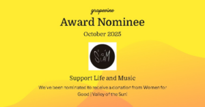 The wonderful Phoenix organization, Women For Good | Valley of the Sun, have seen fit to nominate Support Life And Music to be awarded a donation! We at S.L.A.M. are honored and grateful! We will: Continue working hard, Continue delivering on our promises, Continue improving S.L.A.M.’s services to live up to their belief – – … Continue reading S.L.A.M. is nominated for a Grapevine Award!